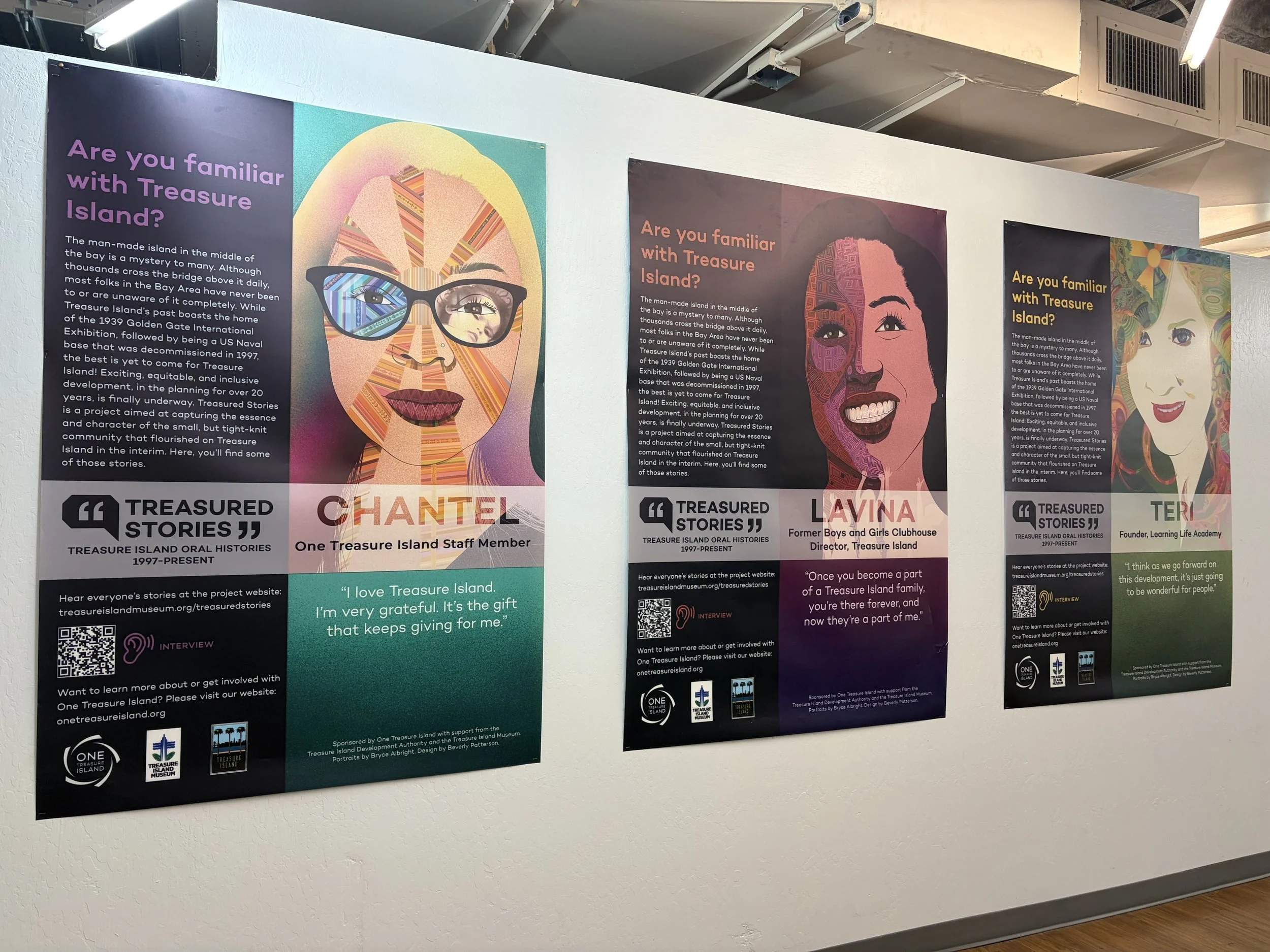 "Treasured Stories" is an exhibition of oral histories surveying Treasure Island from 1997 through the present. Oral histories conducted by One Treasure Island are showcased here and in an in-person exhibit incorporating digital art, quotes, and audio recordings to showcase some of the unique aspects of life and work on Treasure Island over the last twenty-five years.